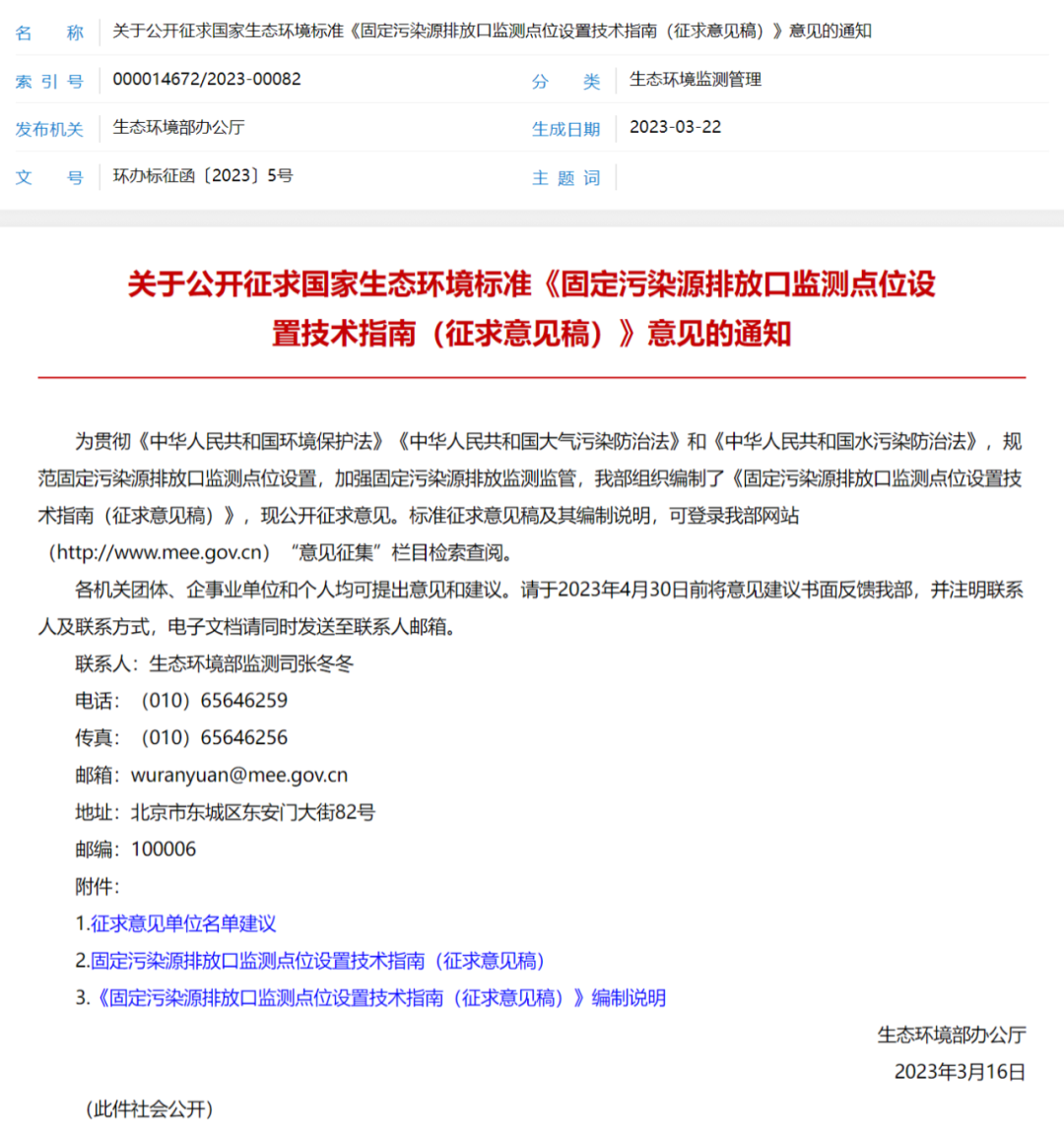 ? 原文鏈接:關(guān)于公開(kāi)征求國家生態(tài)環(huán)境標準《固定污染源排放口監測點(diǎn)位設置技術(shù)指南(征求意見(jiàn)稿)》意見(jiàn)的通知