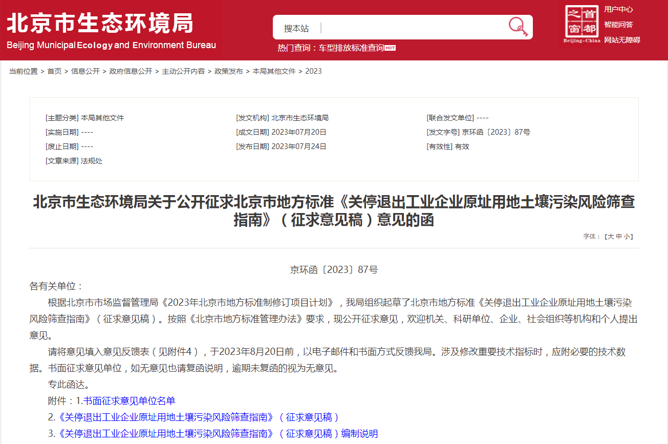 北京市生態(tài)環(huán)境局關(guān)于公開(kāi)征求北京市地方標準《關(guān)停退出工業(yè)企業(yè)原址用地土壤污染風(fēng)險篩查指南》(征求意見(jiàn)稿)意見(jiàn)的函