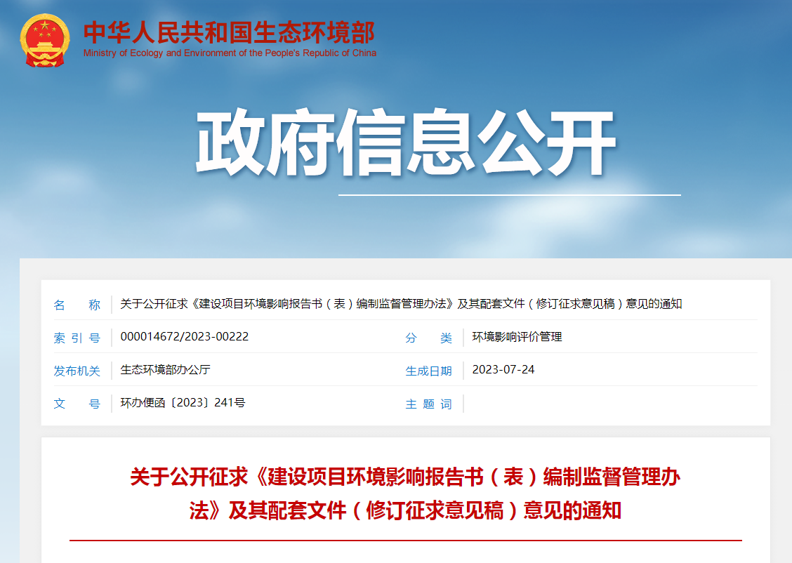 近日生態(tài)環(huán)境部發(fā)布《建設項目環(huán)境影響報告書(shū)(表)編制監督管理辦法》及其配套文件修訂的征求意見(jiàn)稿