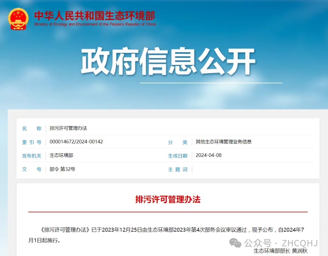 生態(tài)環(huán)境部發(fā)布《排污許可管理辦法》自2024年7月1日起施行
