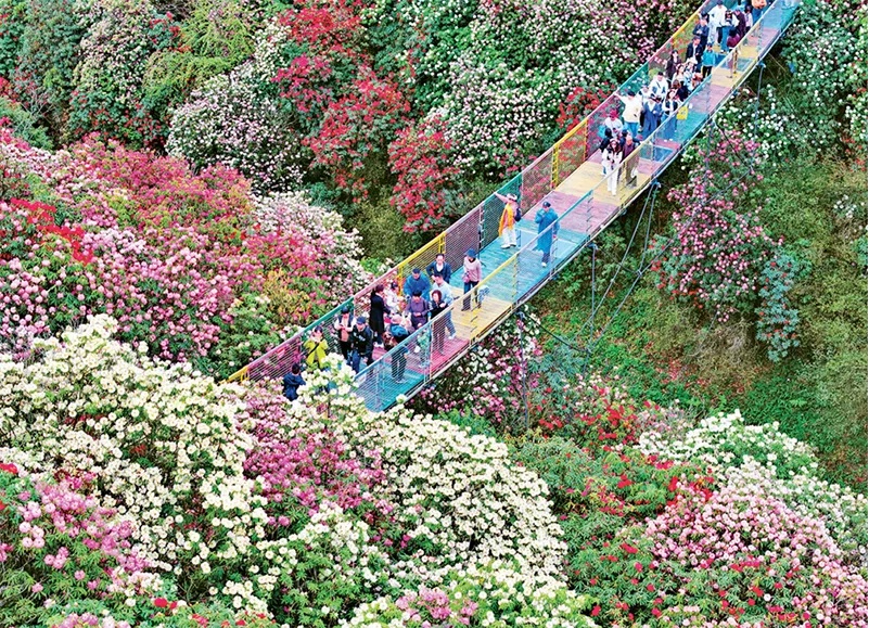 發(fā)展綠色生產(chǎn)力,堅持綠水青山就是金山銀山理念,推動(dòng)經(jīng)濟社會(huì )發(fā)展全面綠色轉型,是滿(mǎn)足人民日益增長(cháng)的優(yōu)美生態(tài)環(huán)境需要的必然要求。圖為2024年4月4日,游客在貴州省畢節市百里杜鵑景區踏青賞花(無(wú)人機照片)。新華社發(fā) 李華/攝