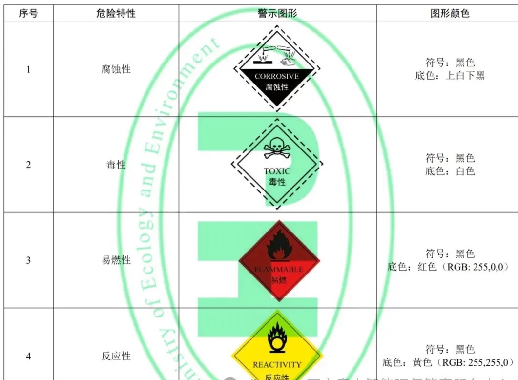 4. 危險廢物的危險特性:包括腐蝕性、毒性、易燃性和反應性,參照危險特性警示圖形,印刷在標簽上相應位置,或單獨打印后粘貼于標簽上相應的位置。