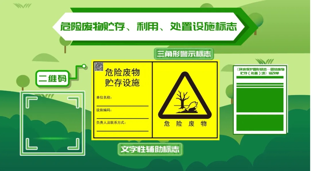 前文提到,設施標志由警示圖形和輔助性文字構成。警示圖形主要用于傳達危險廢物的環(huán)境危害特性,輔助性文字主要用于標明危險廢物設施的類(lèi)型和相關(guān)責任人等信息。值得注意的是,GB 15562.2-1995修改單已將危險廢物貯存、處置場(chǎng)的警告圖形符號由原來(lái)的“骷髏”改為最新的“枯樹(shù)和魚(yú)”,且鼓勵企業(yè)設置二維碼,對設施使用情況進(jìn)行信息化管理。