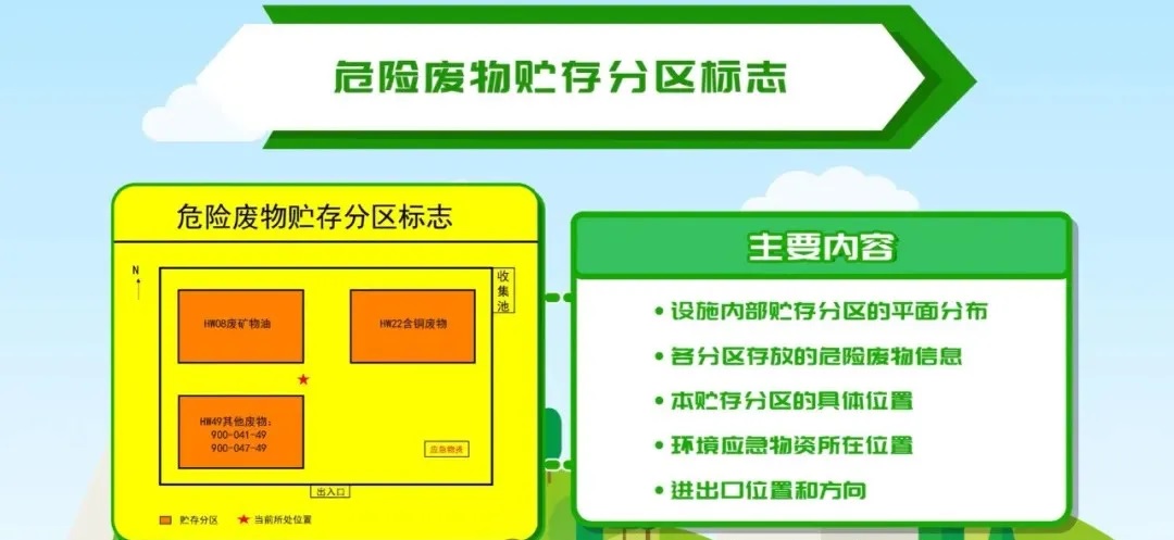 設置要求方面,《規范》要求在每一個(gè)貯存分區都設置危險廢物貯存分區標志,根據實(shí)際情況采取不同的固定形式。