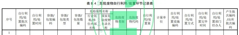 4)危險廢物自行利用/處置環(huán)節,應記錄自行利用/處置批次編碼、自行利用/處置時(shí)間、容器/包裝編碼、容器/包裝類(lèi)型、容器/包裝數量、危險廢物名稱(chēng)、危險廢物類(lèi)別、危險廢物代碼、自行利用/處置量、計量單位、自行利用/處置設施編碼、自行利用/處置方式、自行利用/處置完畢時(shí)間、自行利用/處置部門(mén)經(jīng)辦人、產(chǎn)生批次編碼/出庫批次編碼等。