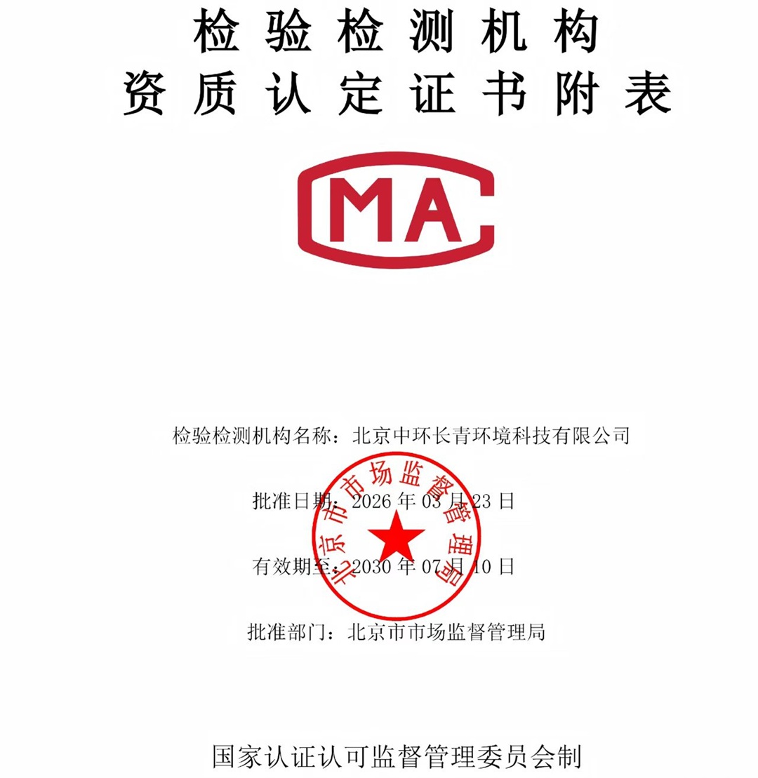 2026年3月23日,中環(huán)長(cháng)青順利通過(guò)北京市市場(chǎng)監督管理局嚴格的評審,正式獲頒檢驗檢測機構資質(zhì)認定(CMA)擴項資質(zhì)證書(shū)。此次資質(zhì)擴項的成功落地,標志著(zhù)公司在環(huán)境檢測領(lǐng)域的技術(shù)實(shí)力與服務(wù)范圍進(jìn)一步拓展。新增資質(zhì)的獲取,是對公司儀器設備精度、技術(shù)人員專(zhuān)業(yè)能力的權威認可。