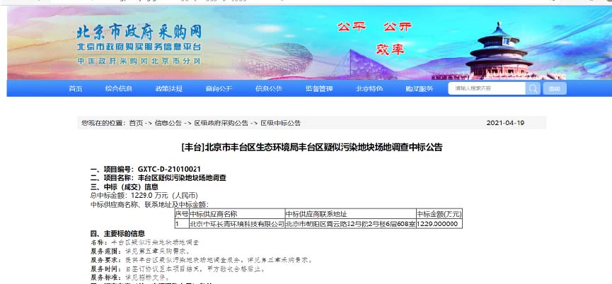 日前,接北京市政府采購網(wǎng)通知:北京中環(huán)長(cháng)青以1229萬(wàn)標的額,順利中標《豐臺區疑似污染地塊場(chǎng)地調查》。