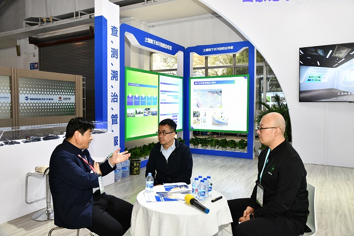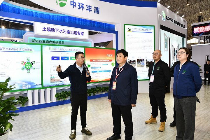 開(kāi)幕式剛一結束,任洪強院士隨即來(lái)到北京中環(huán)豐清展區,參訪(fǎng)、調研、了解中環(huán)豐清技術(shù)團隊近期學(xué)術(shù)成果、技術(shù)定位、發(fā)展方向、行業(yè)拓展模式;聽(tīng)取中環(huán)豐清地下水團隊技術(shù)匯報后,任洪強院士針對土壤、地下水環(huán)境領(lǐng)域“產(chǎn)品-服務(wù)-模式-行業(yè)”全鏈條的技術(shù)要點(diǎn),開(kāi)展悉心講解。