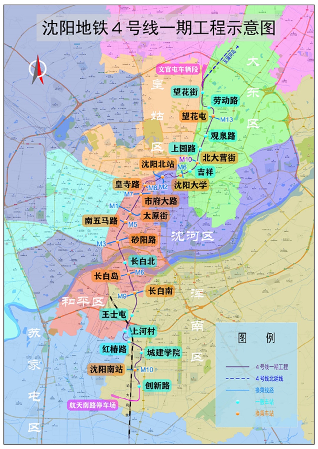 沈陽(yáng)地鐵4號線(xiàn)一期工程北起正新路站,南至創(chuàng )新路站,線(xiàn)路全長(cháng)34公里,共設車(chē)站23座,全部為地下車(chē)站。是遼寧省沈陽(yáng)市第五條建成運營(yíng)的地鐵線(xiàn)路,于2023年9月29日開(kāi)通試運營(yíng)(正新路站至創(chuàng )新路站)。工程線(xiàn)路起于正新路站,途經(jīng)和平區、沈河區、大東區、蘇家屯區、渾南區,貫穿沈陽(yáng)北站、沈陽(yáng)南站、太原街、沈陽(yáng)大學(xué)、長(cháng)白島、渾南產(chǎn)業(yè)區等區域,止于創(chuàng )新路站,大致呈南北走向。采用6節編組B型列車(chē)。