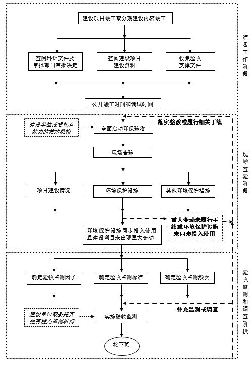 本指南給出建設項目環(huán)境保護驗收一般程序和內容。驗收工作主要包括準備工作、驗收監測(調查)工作和后續工作,其中驗收監測(調查)工作可分為現場(chǎng)查驗、驗收監測和調查、編制驗收報告三個(gè)階段。
